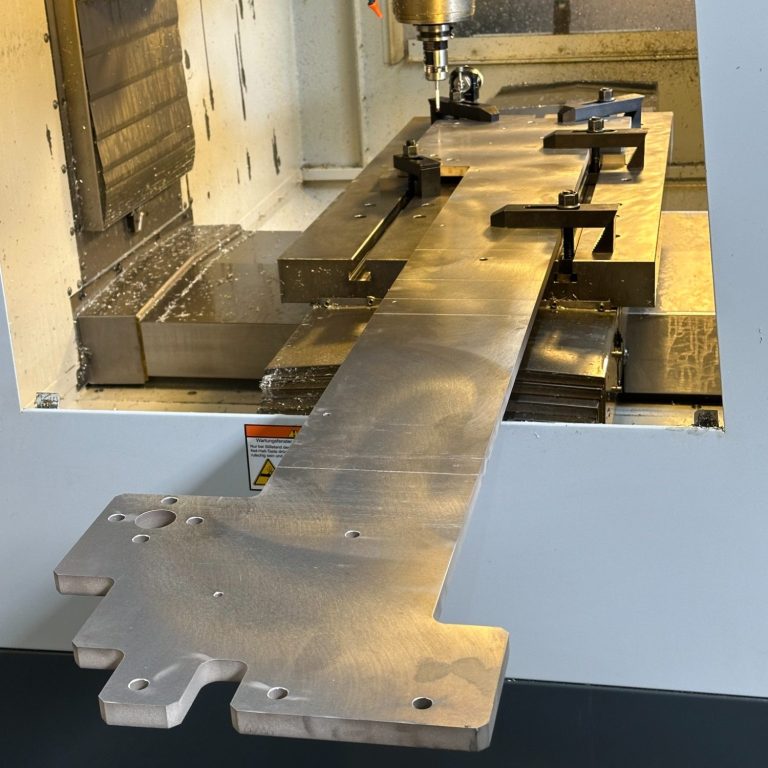 Dank der seitlich öffnenden Fräse können auf Anfrage auch längere Teile präzise bearbeitet werden, solange die Kontur eine versetzte Bearbeitung zulässt.